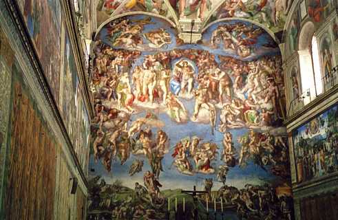 The ceiling of the Sistine Chapel was painted by Michelangelo. The scenes begin with the creation of the world and end with the story of Noah and the flood. The back wall tells the story of the Last Judgement.